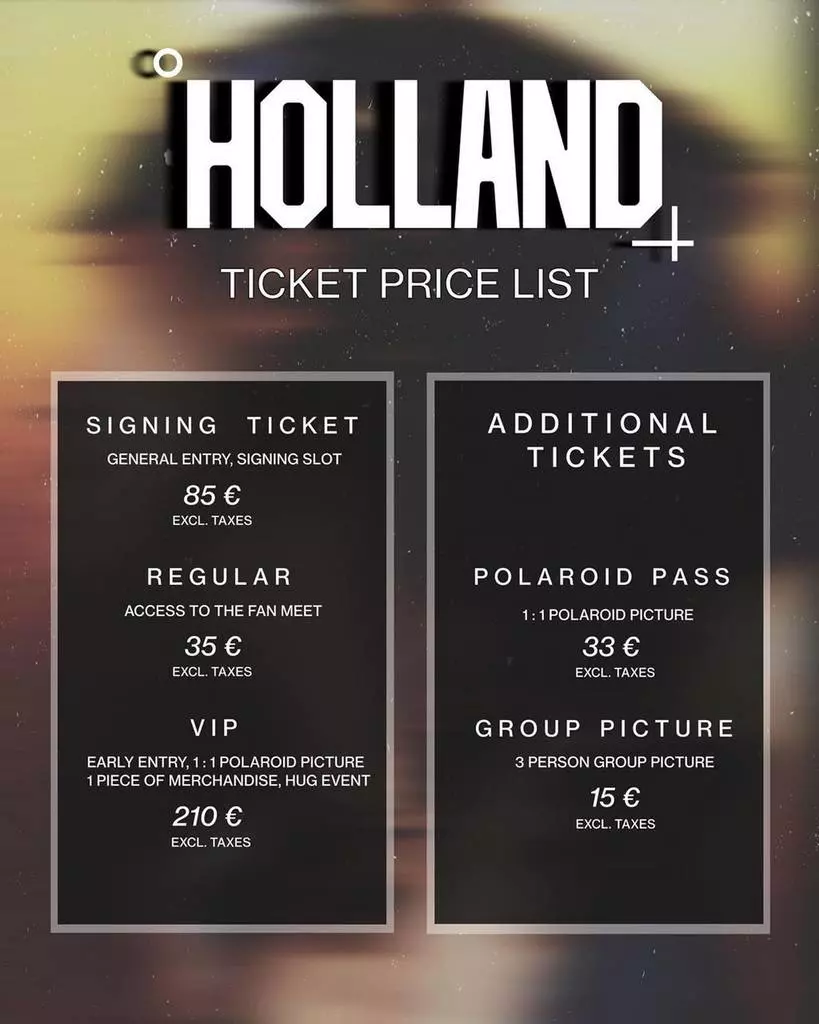 - VIP : 210 € (entrée en premier, un polaroid, des goodies, accès à l’événement pour les câlins)