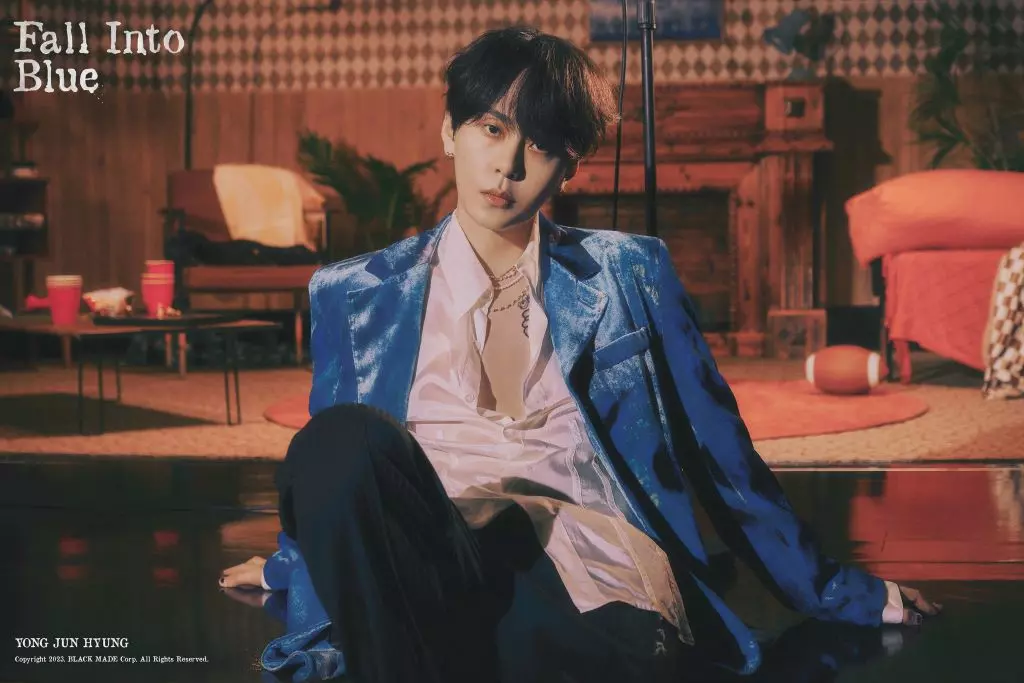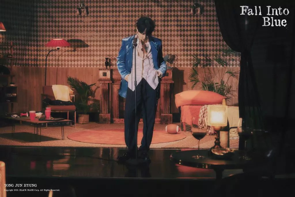 Comme pour son précédent single digital, Jun Hyung reste sur une courte promotion. Vous voyez ci-dessus les quatre photos teasers dévoilées. L’artiste se montre dans un décor très vintage, mélange entre une scène, un bar et un salon. Il est vêtu d’une veste de costume bleue (il allait bien mettre une touche de bleu vu le titre).